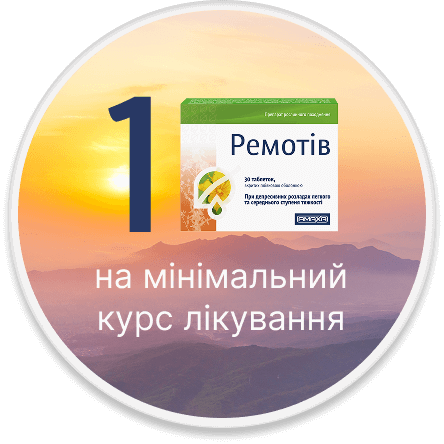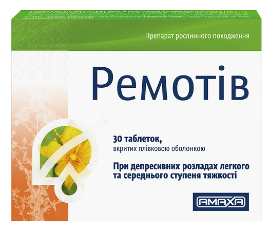 Ремотів – рослинний препарат на основі екстракту St. Jon’s wort для лікування депресивних розладів легкого та середнього ступеня тяжкості, що супроводжуються такими симптомами, як пригнічений настрій, внутрішнє занепокоєння, відчуття хронічної втоми, зміни настрою